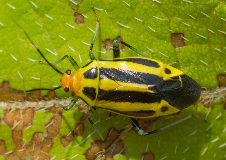 The four–lined plant bug, Poecilocapus lineatus which is easily identified by the four black strips running down its back, has a wide range of hosts including: fruits, vegetables, flowers, herbs, and cucurbits. Many of our customers have brought in plants that a covered with a series of ugly, purple spots....